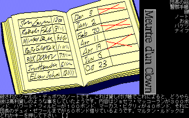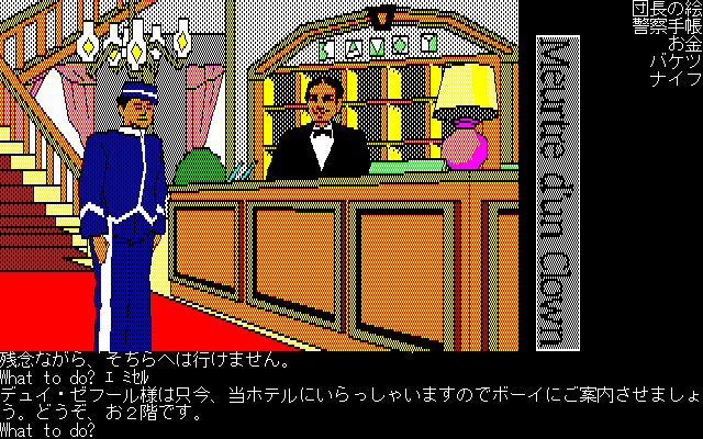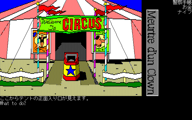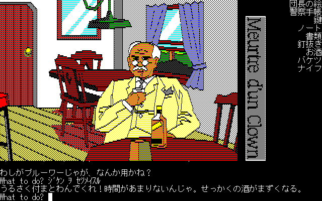 アドベンチャーゲームの初期のスタイルのコマンド入力方式にて進行します。正直面倒な部分でもありますが、コマンド入力は英語と日本語両方に対応し、日本語の場合「名刺+動詞」のほか「名詞+助動詞+動詞」でも入力を受け付けます。結構親切設計です。シンキングラビットは、コマンド選択方式が主流になってきてからも、コマンド入力方式を採用してましたね。今となっては、ほぼ廃れたしまったコマンド入力方式ですが、昔のPCゲームならではの味わいがあります。