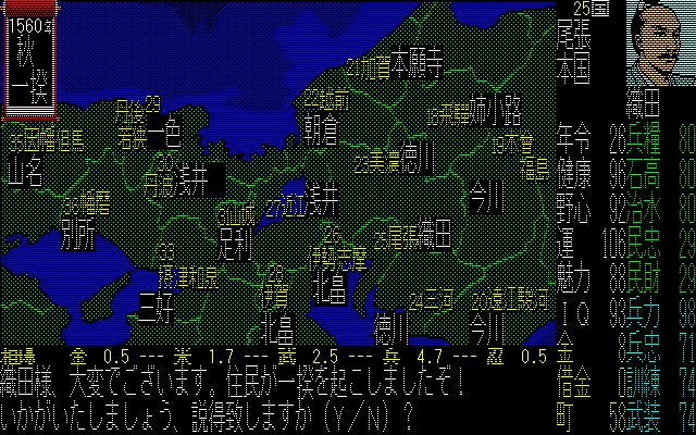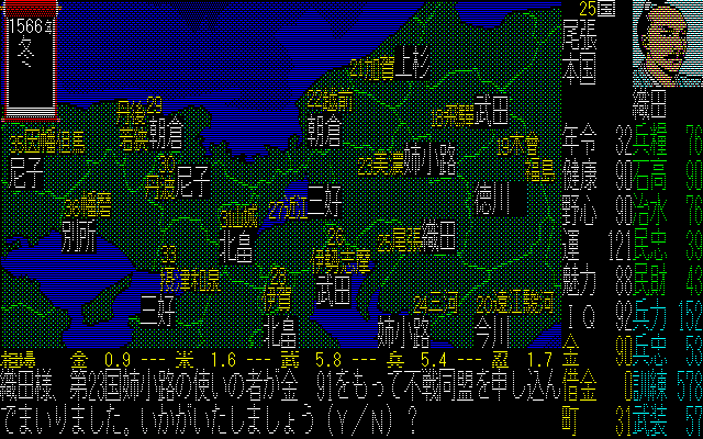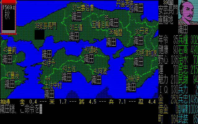 ふっふっふ。関西から中部にかけては、制覇してしまった。信長のパラメーターが違うのは、やり直したからだ。30代後半になっても、まだ1か国から抜け出せなかったんだもん。どう考えても天下統一には寿命が間に合わない。という事で、生まれ変わった信長であった。