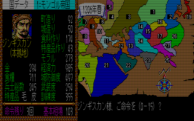 1987年12月光栄から発売された歴史シミュレーションゲーム。もちろんプロデューサーはシブサワ・コウです。プレイヤーはモンゴル帝国の創設者であるジンギスカンとなり、世界を征服することが目標となっています。
